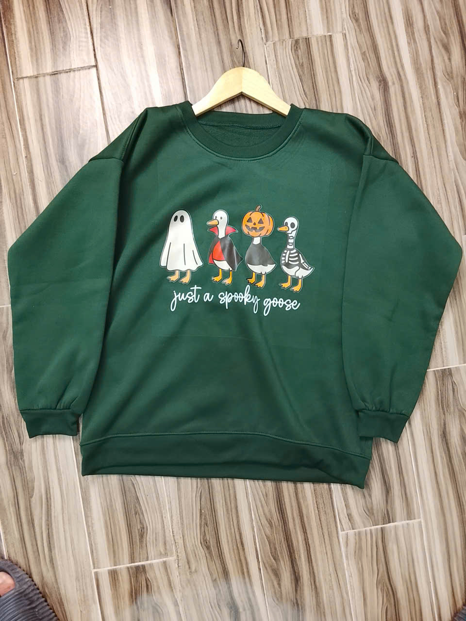 Forest-green crewneck with a playful “just a spooky goose” graphic across the front. Soft fleece feel, regular unisex fit.