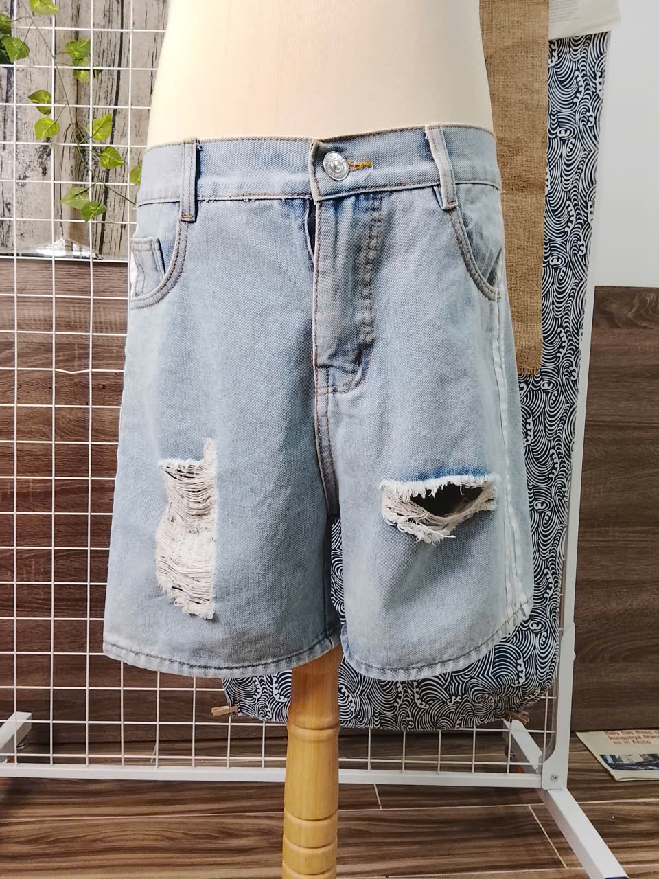 Light-blue denim shorts with ripped details. Mid-rise, above-knee length, classic 5-pocket design with zip fly and button. Regular fit.