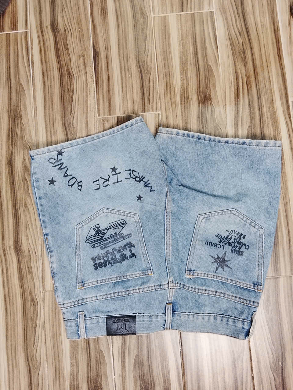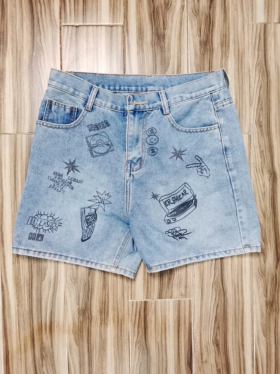 Light-blue denim shorts with playful doodle prints. Mid-rise, straight leg above the knee with classic 5-pocket styling and zip fly with button.