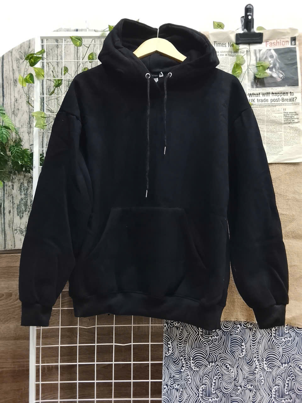 Minimal black hoodie with a regular unisex fit. Soft fleece interior, drawstring hood, and kangaroo pocket; ribbed cuffs and hem for comfort.
